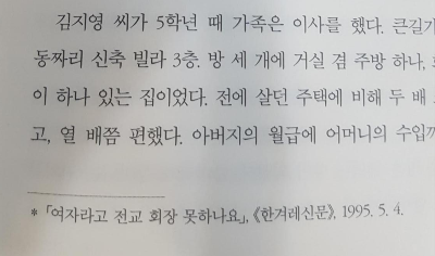 분량이 길지 않아 금방 읽었는데, 읽으면서 불편한 면이 없잖아 있었다. 내가 남자라서가 아니라, 성의 대결로 몰아가는 소설의 전개가 마음에 안들었고, 일방적으로 피해를 당하는 것으로 묘사한 주인공 김지영의 모습도 조금은 현실과 괴리가 있기 때문이었다. 작가는 매체의 출처를 밝히면서, 성차별에 대한 사실 관계를 확고히 밝히고자 했다. 소설 속에 주석을 다는 작가도 없진 않지만 흔하진 않은 것 같다. 하지만 이 책에서는 아래와 같은 주석이 수없이 나온다. 마치 소설이 아닌 페미니즘 보고서 처럼..