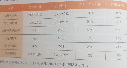 코스피지수를 보면, 2010년 말이 2051이었고, 2018년 말에도 그 수치를 벗어나지 못했다. 8년간 누적 수익률이 0%다. 삼성전자, SK하이닉스 등 시장을 리드하는 대기업을 빼고 나머지 회사의 지수는 오히려 8년 전에 비해 내렸다고 볼 수 있다. 이에 반해 나스닥과 S&P500의 누적 수익률은 각각 150%, 99%다. 연평균 수익률이 10%를 상회한다.