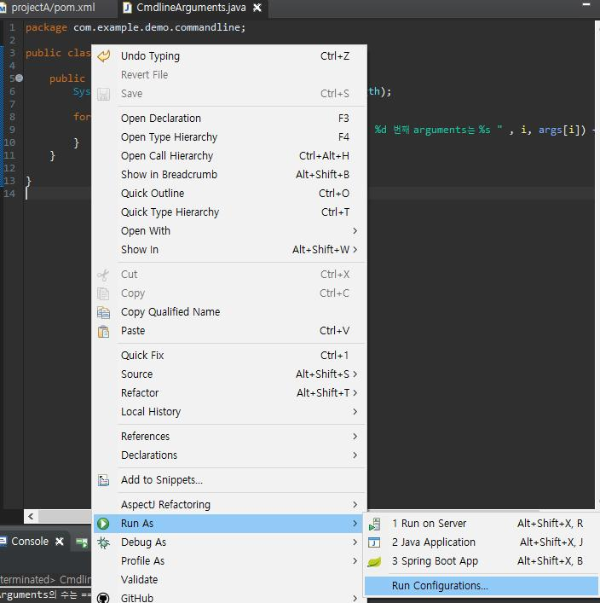 소스코딩 화면에서 마우스 우클릭 -> Run As -> Run Configurations 를 선택하여, 아래 화면의 Arguments 탭을 선택한다.