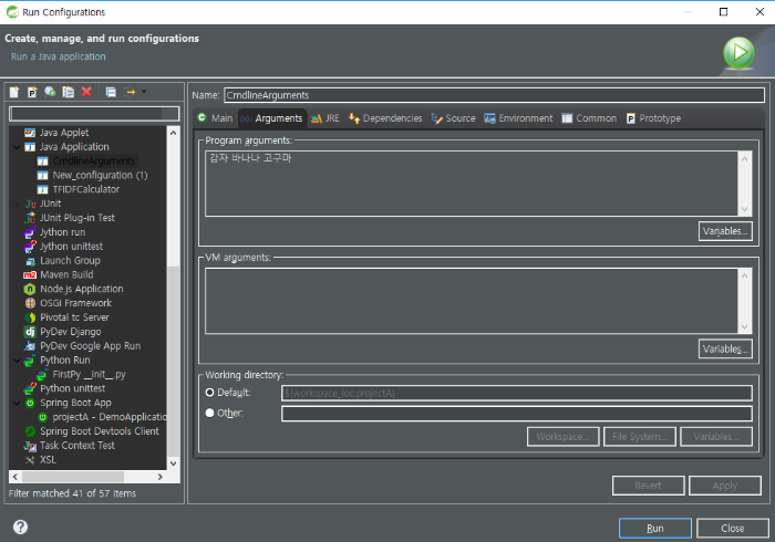 Program arguments에 위와 같이 argument로 전달할 데이터를 입력한 후, Run 버튼을 선택하면 아래와 같은 결과가 나온다.